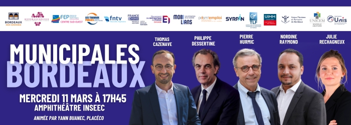 11Mar17h4521h00Municipales 2026 | Rencontres Entrepreneurs/Candidats - BordeauxInscription obligatoire - Rencontre entre les candidats aux Municipales 2026 et les entrepreneurs girondins, à Bordeaux17h45 - 21h00 CatégorieEvènement