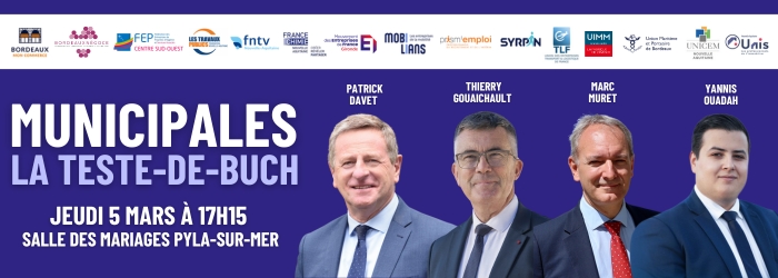 05Mar17h1520h00Municipales 2026 | Rencontres Entrepreneurs/Candidats - La Teste de BuchInscription obligatoire - Rencontre entre les candidats aux Municipales 2026 et les entrepreneurs girondins, à La Teste de Buch17h15 - 20h00 CatégorieEvènement